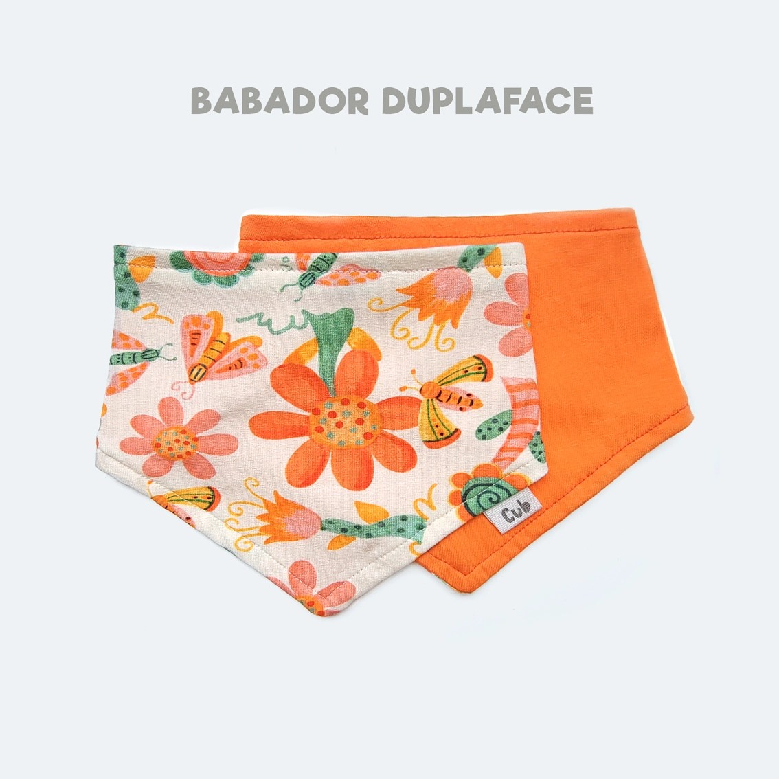 1 Babador Bandana Cotton 96% algodão 4% Elastano. Dupla face, laranja com estampa mariposas.